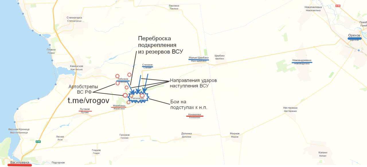 Рогов пишет, что Пятихатки находятся в полукольце российских войск, которые ведут его обстрел и предполагает, что ВСУ попытаются это полукольцо "разжать" и развернуть наступление в сторону Васильевки через село Жеребянки.