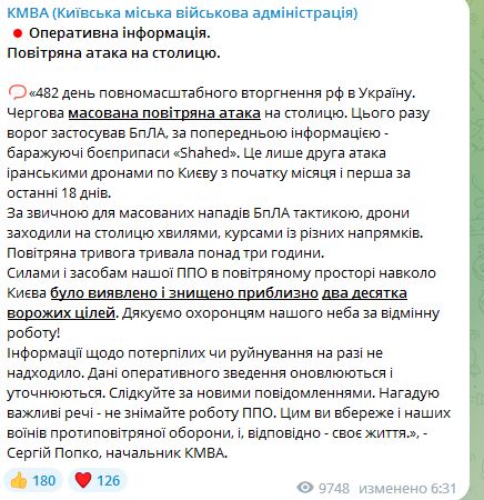 07.15 Ночью в Киеве воздушная тревога длилась три часа. За это время россияне волнами выпустили около двух десятков беспилотников на столицу. Все они был сбиты силами ПВО.