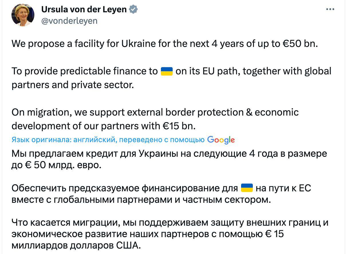 16.13 Глава Еврокомиссии Урсула фон дер Ляйен подтвердила планы Евросоюза выделить Украине 50 миллиардов евро финансовой помощи на следующие четыре года.
