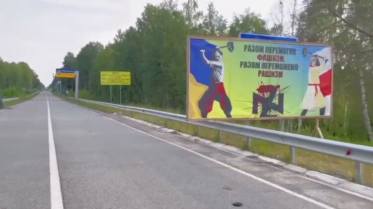А в начале мая на украинско-белорусской границе развернулась "война баннеров". Вдоль границы с Беларусью появились новые баннеры, на которых изображен украинец и белорус в национальной одежде с кувалдами, которые замахиваются на свастику, собранную из двух символов вторжения "Z".