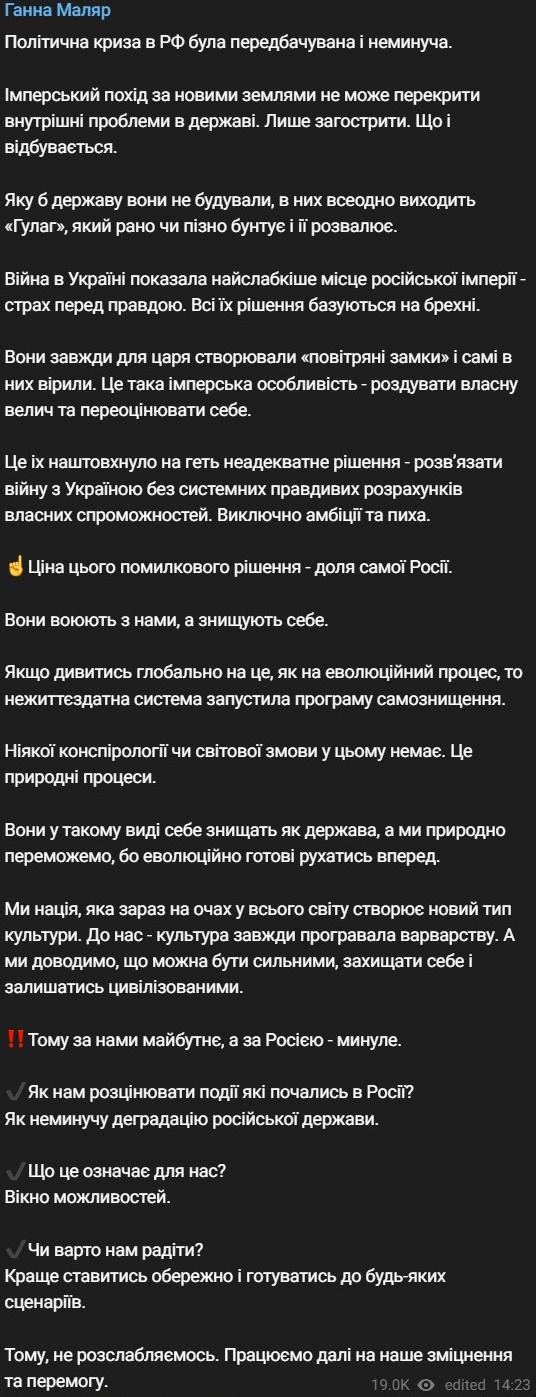"Какое бы государство они ни строили, у них все равно выходит "Гулаг", который рано или поздно бунтует и разваливает. Война в Украине показала самое слабое место российской империи – страх перед правдой. Все их решения базируются на лжи. Они всегда для царя создавали "воздушные замки" и сами в них верили. Это такая имперская особенность – раздувать собственное величие и переоценивать себя", - написала Маляр.