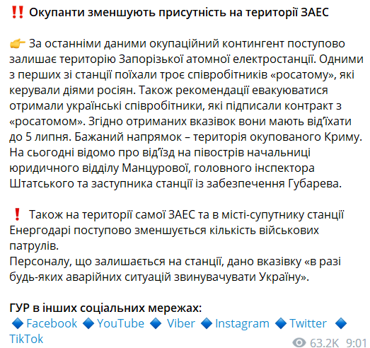 "Одними из первых со станции уехали трое сотрудников "Росатома", руководивших действиями россиян. Также рекомендации эвакуироваться получили украинские сотрудники, подписавшие контракт с "Росатомом". Согласно полученным указаниям, они должны отъехать до 5 июля. Желательное направление – территория оккупированного Крыма. На сегодняшний день известно об отъезде на полуостров начальницы юридического отдела Манцуровой, главного инспектора Штатского и заместителя станции по обеспечению Губарева", - говорится в сообщении ГУР.