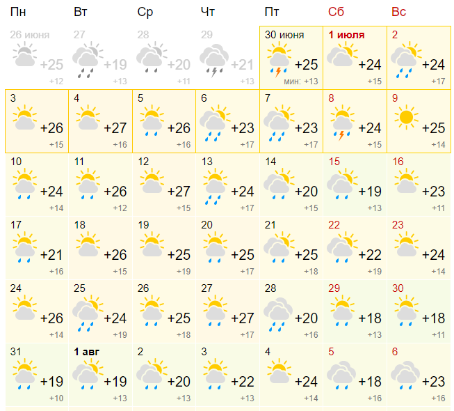 Средняя температура днем +25. Ниже двадцати градусов столбики термометров будут опускаться лишь один раз, 29-го числа, до +18.