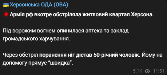 Сообщается, что под обстрел попала аптека и кафе в одном из жилых кварталов в Херсоне. Из-за обстрела ранения ног получил 50-летний мужчина.