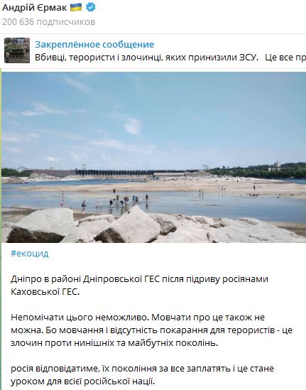 Глава Офиса президента Андрей Ермак публикует фото, как сейчас выглядит Днепр в районе Днепровской ГЭС на севере Запорожья.