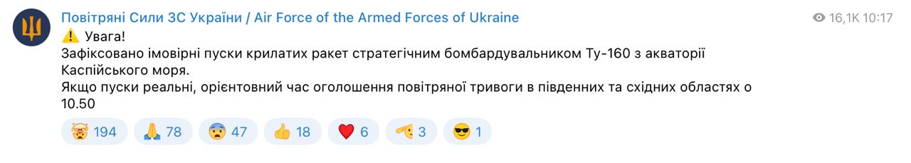 Если пуски реальны, ориентировочное время объявления воздушной тревоги в южных и восточных областях - 10:50.