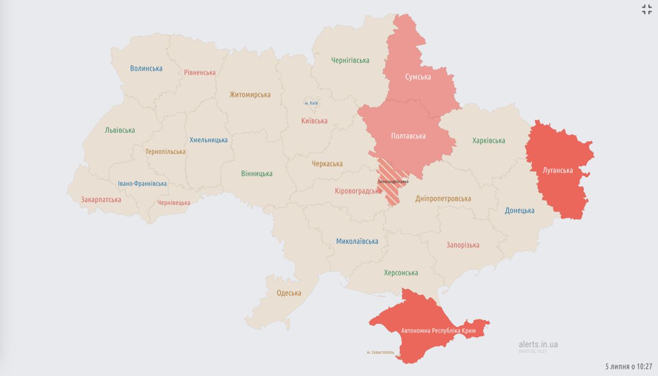 Опасность ракетных ударов есть в Сумской и Полтавской областях, предупреждают Воздушные силы. Там объявлена воздушная тревога.