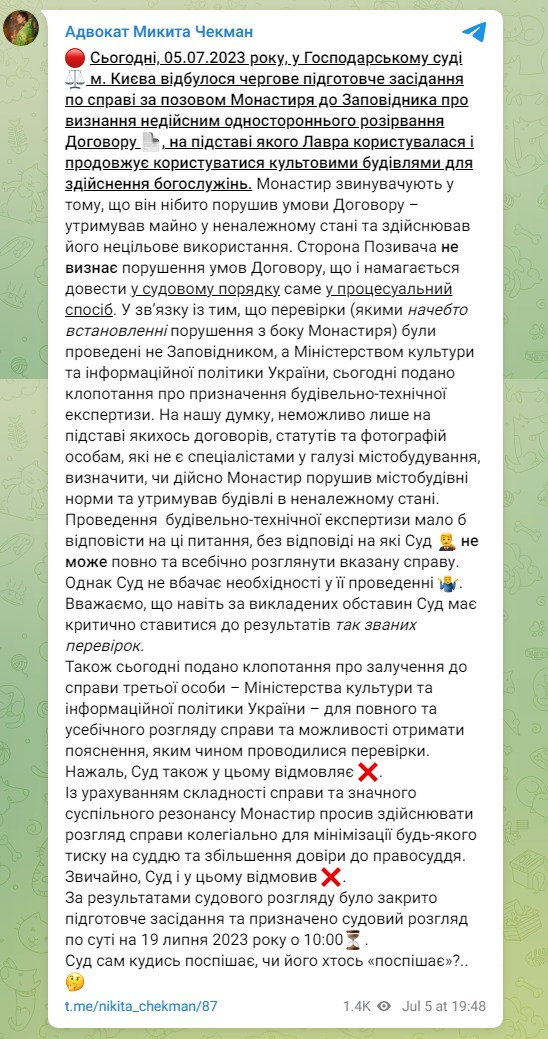 "Сегодня, 05.07.2023, в Хозяйственном суде Киева состоялось очередное подготовительное заседание по делу по иску монастыря к заповеднику о признании недействительным одностороннего расторжения договора, на основании которого лавра пользовалась и продолжает пользоваться культовыми зданиями. Монастырь обвиняют в том, что он якобы нарушил условия договора – удерживал имущество в неположенном состоянии и использовал не по назначению. Сторона истца не признает нарушения условий договора, что и пытается доказать в судебном порядке именно процессуальным способом", - сказано в посте.