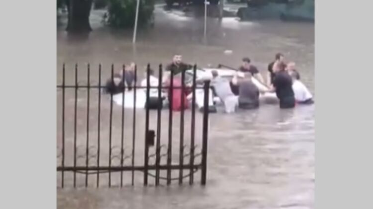 На видео можно заметить, что полицейские помогают жителям спасаться от непогоды.