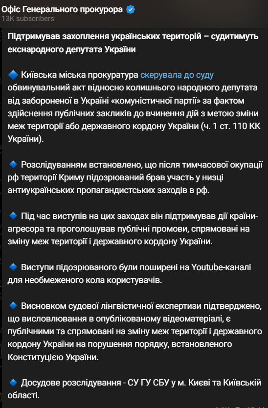 Прокуратура объявила о подозрении бывшему нардепу от запрещенной Компартии Украины Георгию Буйко. Его обвиняют в публичной поддержке российской агрессии.