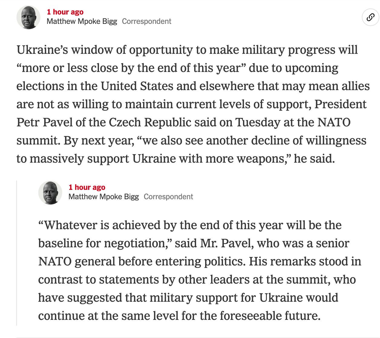 NYT отмечает, что заявление Павела контрастирует с высказываниями других лидеров на саммите, которые говорят о поддержке Украины столько, сколько потребуется.