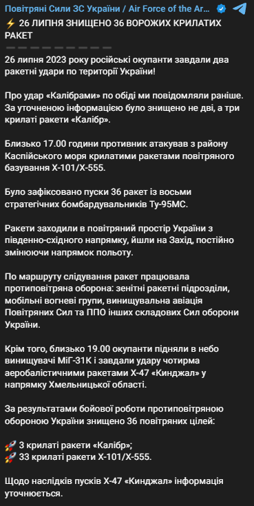 Как уже ранее сообщалось, 36 ракет (3 крылатых ракеты "Калибр" и 33 крылатых ракеты Х-101/Х-555) сбиты.