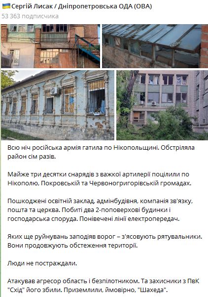 07.35 Ночью РФ семь раз обстреляла из тяжелой артиллерии Никопольский район Днепропетровской области.