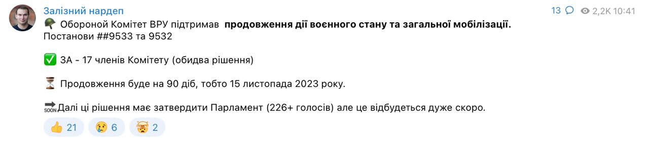 Парламентский комитет поддержал продление военного положения и мобилизации в Украине до 15 ноября.