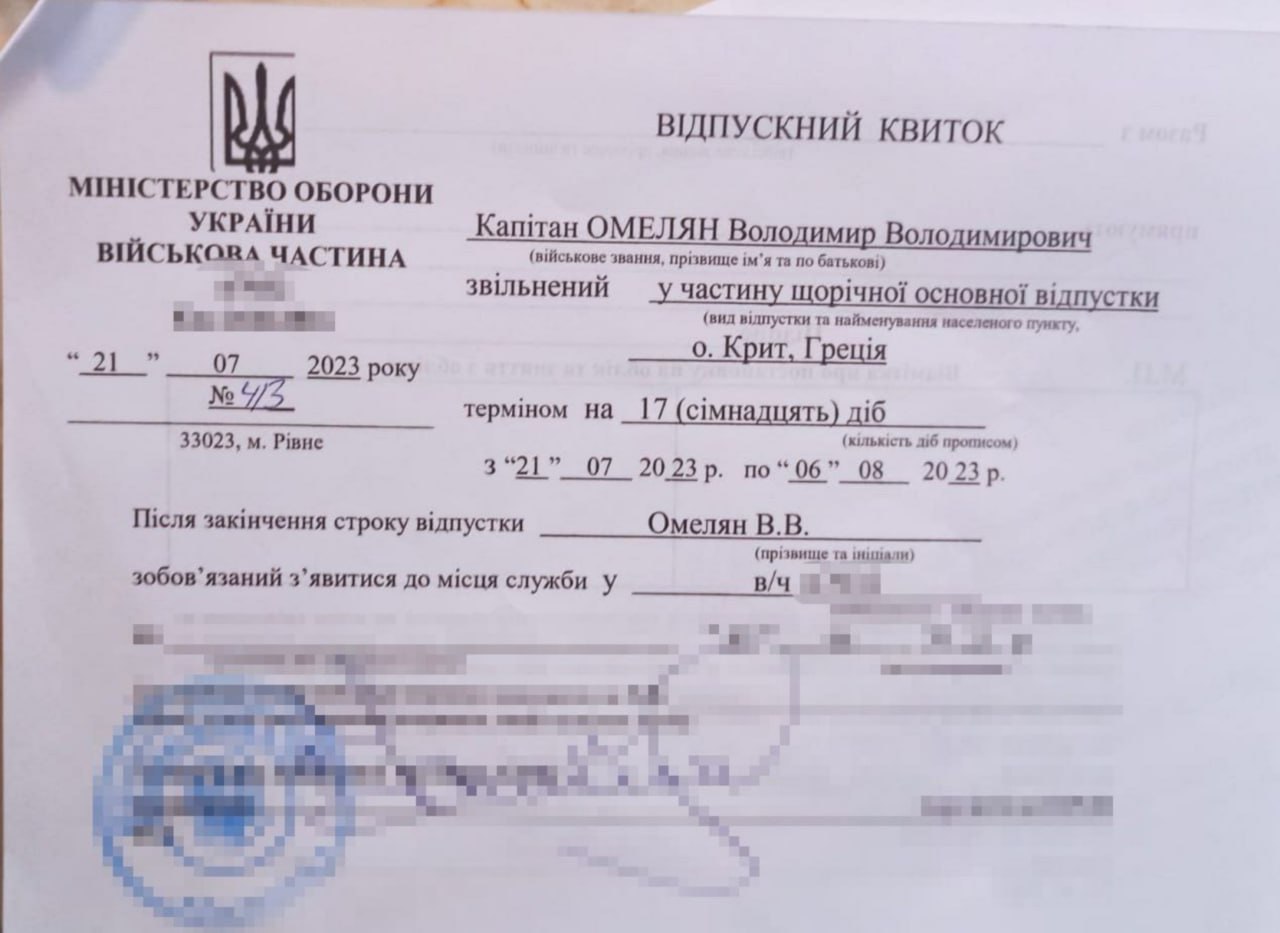 Там указано, что командование воинской части, расположенной в Ровно, не возражает, чтобы 17 дней из положенного ему отпуска Омелян провел на Крите, в городе Ретимно.