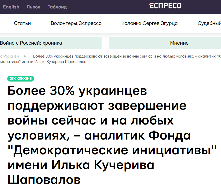 "В опросах украинцев по поводу результатов войны мы сделали акцент на усталости от войны или на готовности граждан идти на компромиссы. Поскольку вера в победу - хорошо, но есть реальность. Поэтому мы спросили украинцев о том, готовы ли они были бы к завершению войны в ближайшее время, но любой ценой. Другой вопрос заключался в готовности дальше вести борьбу, если это нужно для победы. Более 30% наших граждан согласились с тем, чтобы война завершилась в ближайшее время любой ценой, и 53% готовы дальше вести борьбу. Это немного тревожные цифры. Однако следует заметить, что когда мы спросили об условиях прекращения войны и назвали отказ Украины от вступления в НАТО и оставление оккупированных территорий России, то даже те граждане, которые поддерживали завершение войны в ближайшее время, назвали эти условия для них неприемлемыми", - сказал аналитик.