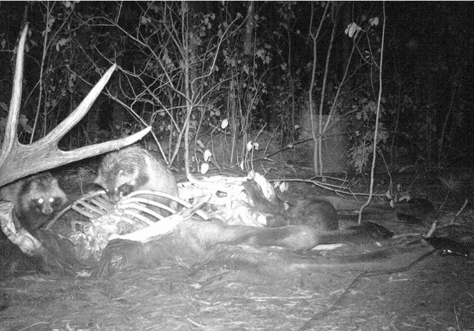 Чернобыльский радиационно-экологический биосферный заповедник опубликовал фото енотов, объедающих тушу погибшего крупного копытного - лося.