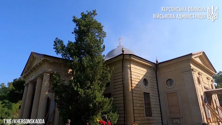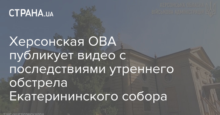 Херсонская ОВА публикует видео с последствиями утреннего обстрела Екатерининского собора в центре города.