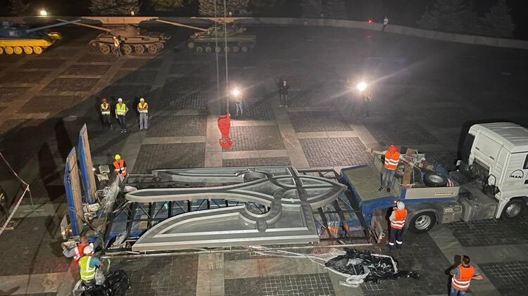 К монументу "Родина-Мать" привезли новый герб - трезубец, который установят вместо демонтированной советской символики.