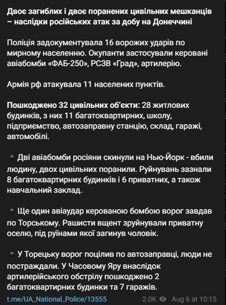 "Оккупанты применили управляемые авиабомбы "ФАБ-250", РСЗО "Град", артиллерию. Армия России атаковала 11 населенных пунктов. Повреждены 32 гражданских объекта: 28 жилых домов, из них 11 многоквартирных, школа, предприятие, автозаправочная станция, склад, гаражи, автомобили", - говорится в сообщении Нацполиции.