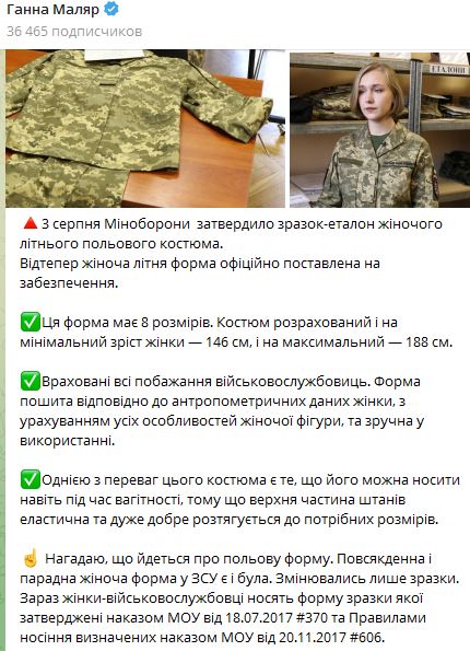 Как сообщила замминистра Анна Маляр в своем тг-канале, теперь женская летняя форма официально поставлена на обеспечение.