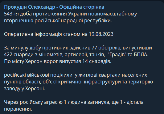 Александр Прокудин сообщил о новом обстреле Херсонской области. Фото: Телеграм