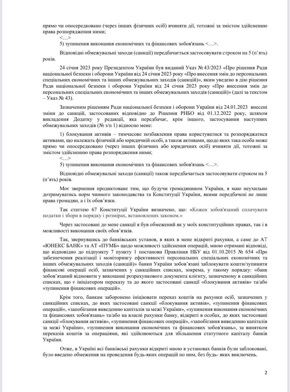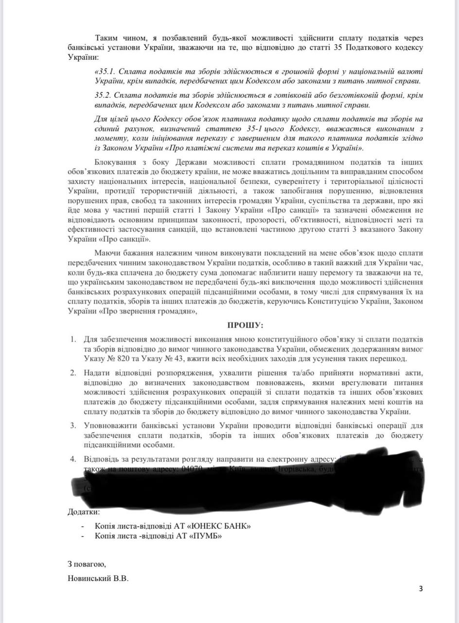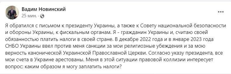 "Я обратился с письмом к президенту Украины, а также к Совету национальной безопасности и обороны Украины, к фискальным органам. Я – гражданин Украины и считаю своей обязанностью платить налоги в своей стране. В декабре 2022 года и в январе 2023 года СНБО Украины ввел против меня санкции за мои религиозные убеждения и за мою верность канонической Украинской православной церкви. Согласно указу президента все мои счета в Украине арестованы. Меня в этой ситуации правовой коллизии интересует вопрос: каким образом я могу заплатить налоги?" – написал Новинский.