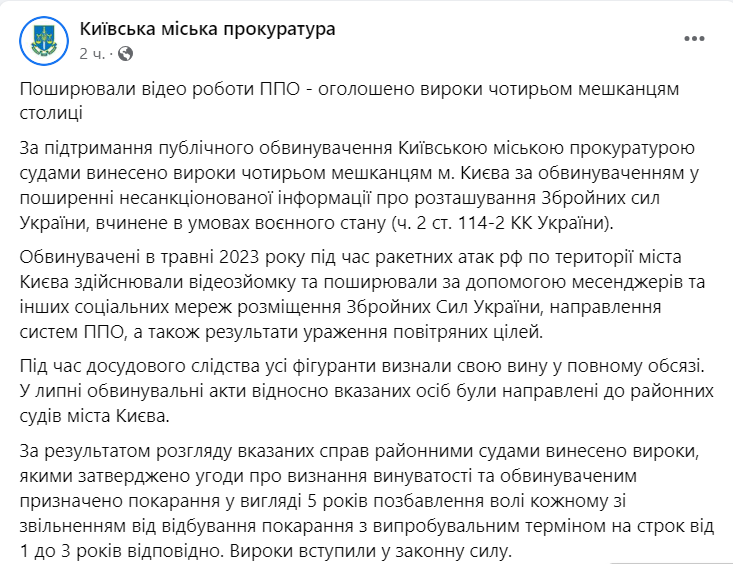 "Обвиняемые в мае 2023 года во время ракетных атак России по территории города Киева осуществляли видеосъемку и распространяли с помощью мессенджеров и других социальных сетей размещение Вооруженных сил Украины, направление систем ПВО, а также результаты поражения воздушных целей", - говорится в сообщении.