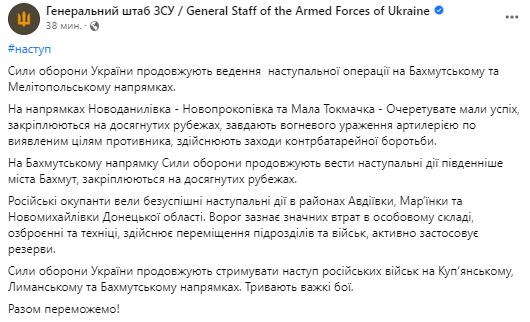 Силы обороны Украины продолжают вести наступательную операцию на Бахмутском и Мелитопольском направлениях.