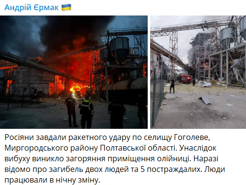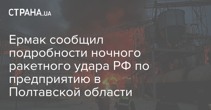 Ермак сообщил подробности ночного ракетного удара РФ по предприятию в Полтавской области