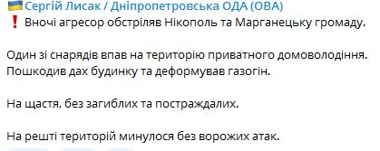 Целью был Никополь и Марганецкая громада. Обошлось без пострадавших. Повреждена крыша частного дома и газогон.