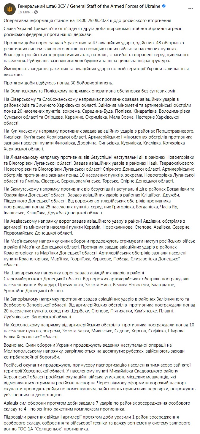 Генштаб ВСУ опубликовал оперативную информацию о российском вторжении по состоянию на 18:00 29 августа.