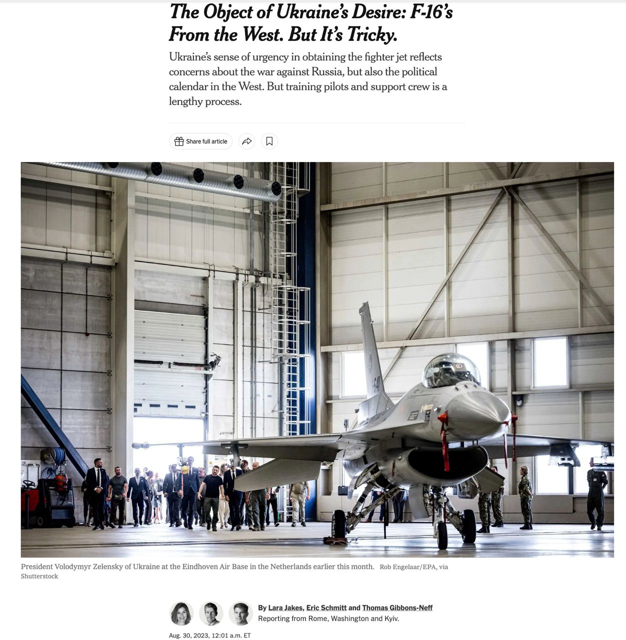 Источники NYT в Киеве и Вашингтоне говорят, что Украина требует истребители, чувствуя, что "политические часы тикают", а Зеленский хочет получить как можно больше F-16 до выборов в Европе и США, "что может привести к изменению взглядов в правительствах, которые обещали эти самолеты", а также хочет закрепить обязательства Запада на случай подрыва западной поддержки.