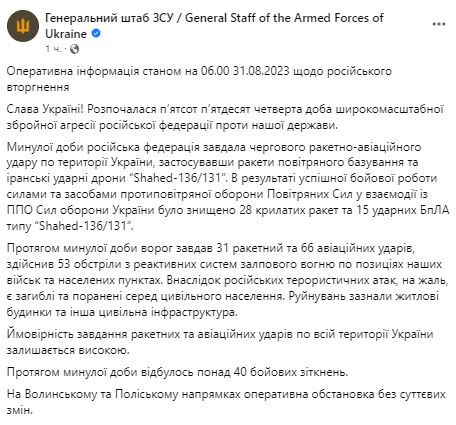 Утром 31 августа Генштаб ВСУ публикует сводку о ситуации на фронте.