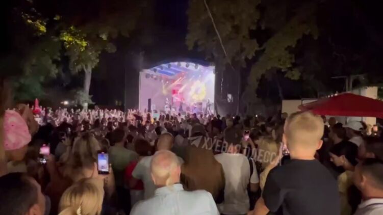 Горожане заполнили крытые павильоны развлекательных заведений, уличные столики кафе. На кадрах можно заметить танцующих улыбающихся девушек, рок-группу, выступающую на установленной посреди площади сцене, и пару, проезжающую по заполненной одесситами улице на трицикле.