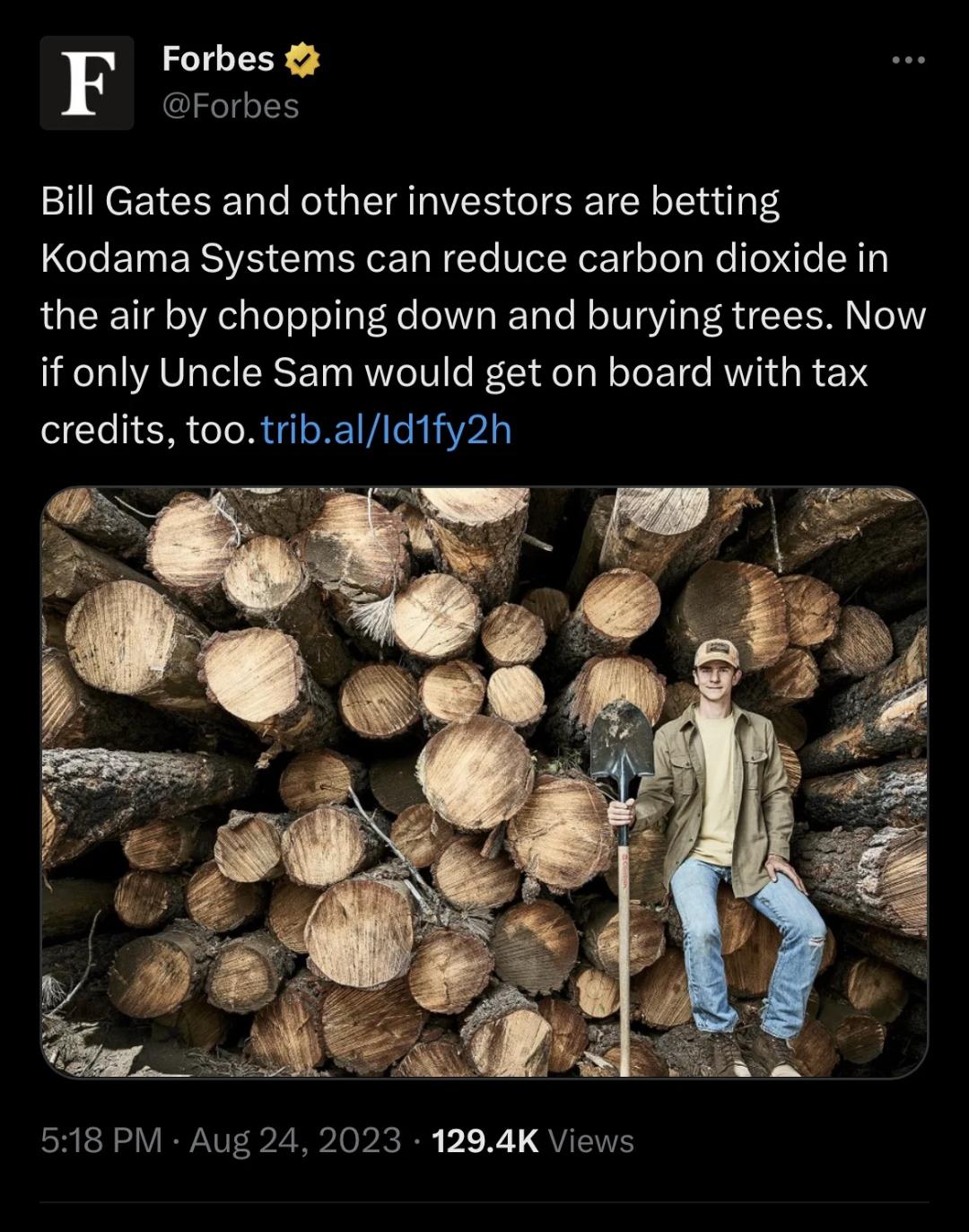 В заметке издания сообщается, что компания Kodama привлекла в свой проект вырубки деревьев 6,6 млн долларов в виде начального финансирования от Breakthrough Energy Билла Гейтса и других фирм. После вырубки деревьев их закапывают, что помогает замедлить изменение климата и получить выгодные квоты на выбросы углерода.