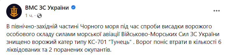 При попытке высадки россиян в северо-западной части Черного моря украинская авиация нанесла удар по российскому катеру типа КС-701 "Тунец".