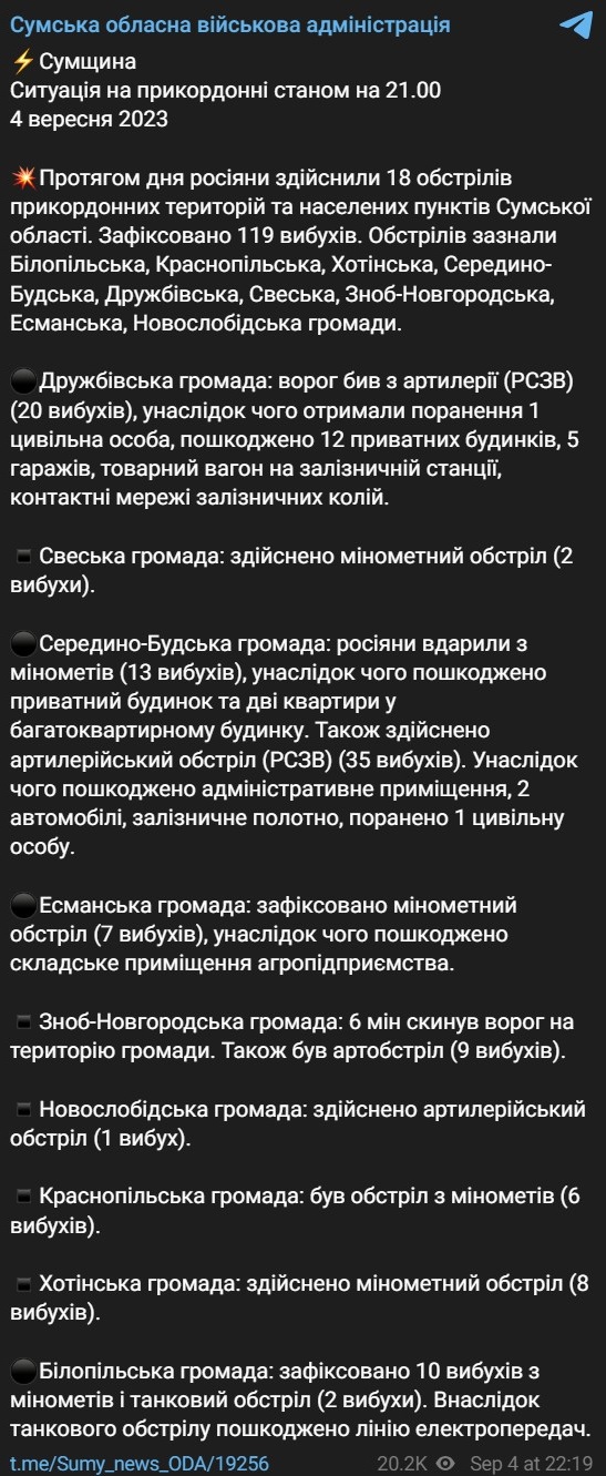 В течение минувшего дня россияне совершили 18 обстрелов приграничных территорий и населенных пунктов Сумской области. Зафиксировано 119 взрывов. Обстрелы потерпели Белопольская, Краснопольская, Хотинская, Середино-Будская, Дружбовская, Свесская, Зноб-Новгородская, Эсманская, Новослободская громады.