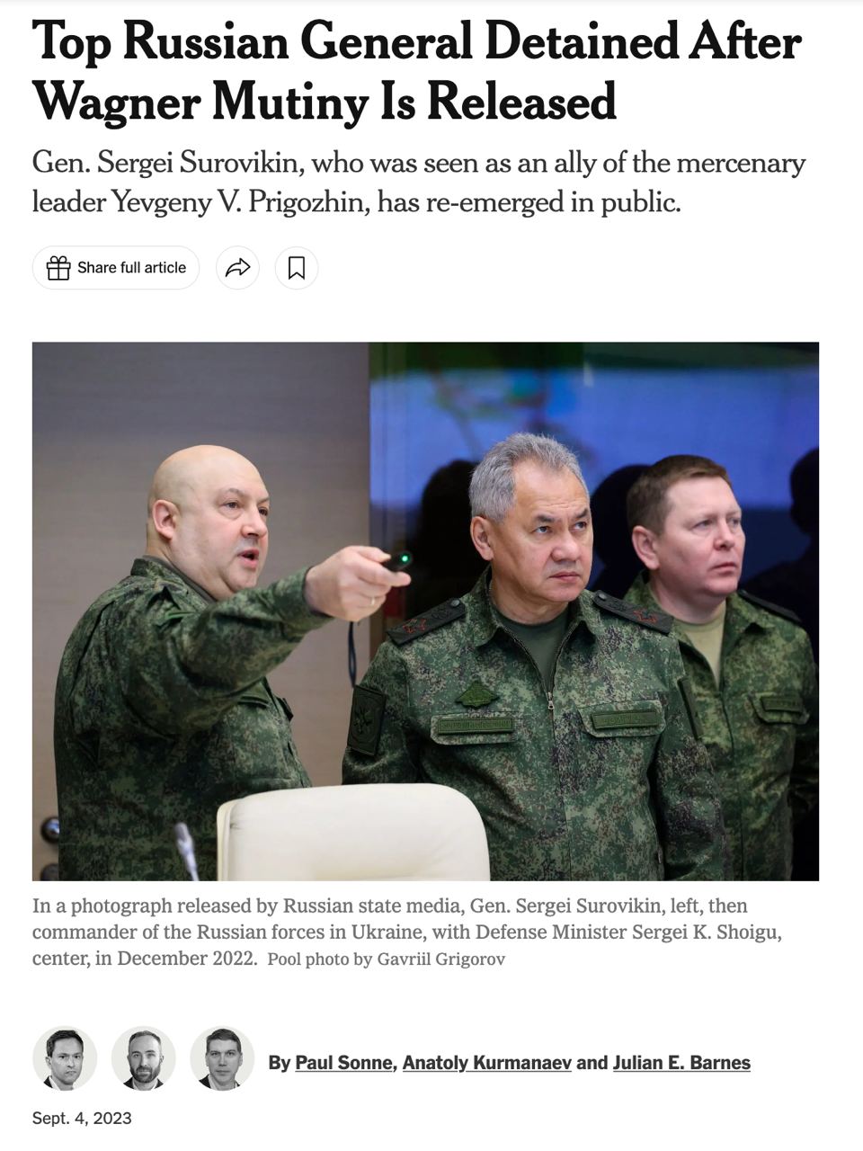 Собеседники NYT говорят, что, хотя Суровикин, судя по всему, был освобожден из-под стражи, остается неясным, сохраняются ли в отношении него какие-либо ограничения.