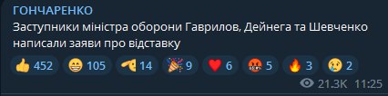 Речь идет о заместителе министра обороны Владимире Гаврилове, заместителе по вопросам цифрового развития, цифровых трансформаций и цифровизации Виталии Дейнеге и заместителе по европейской интеграции Андрее Шевченко.