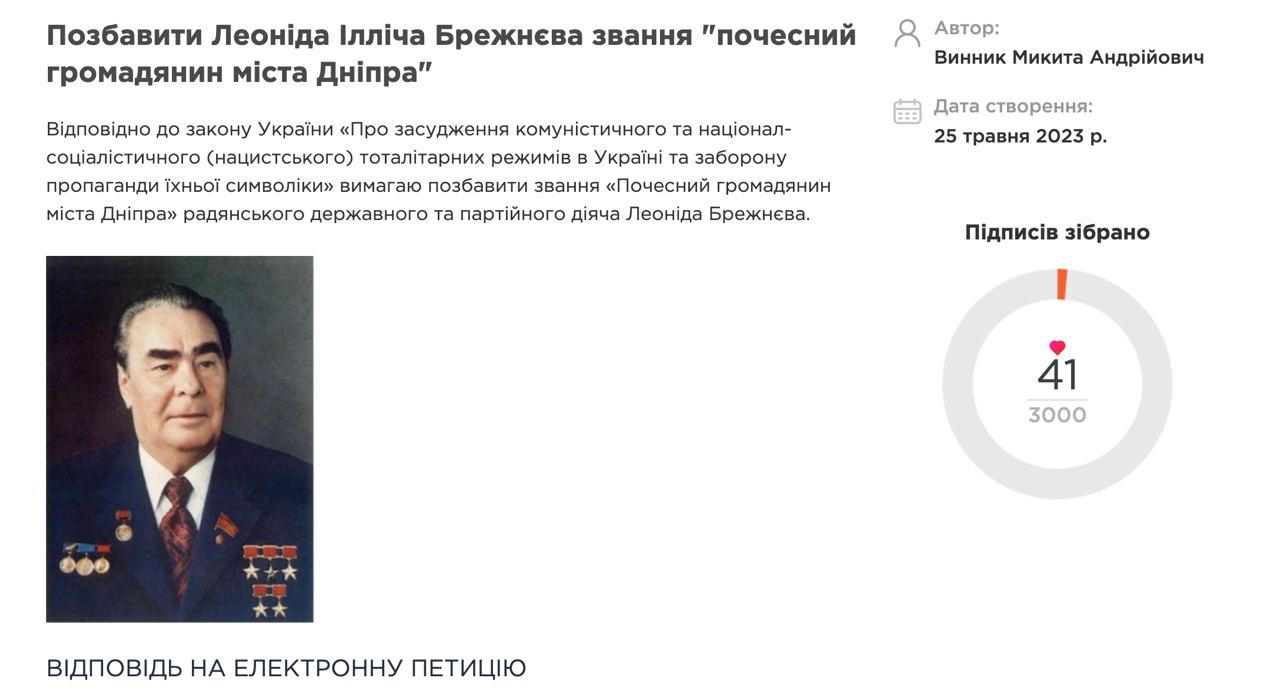 В своем ответе они пишут, что Брежнев был награжден званием "Почетный гражданин города Днепропетровска", которое потеряло силу в 2017 году, когда было введено звание "Почетный гражданин города Днепра". А старого звания можно лишить только после личного обращения гражданина или вступления в законную силу обвинительного приговора в его отношении.