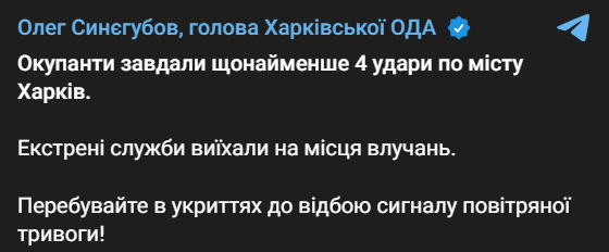 "Оккупанты нанесли по меньшей мере 4 удара по городу Харьков. Экстренные службы выехали на места попадания", - написал Синегубов.