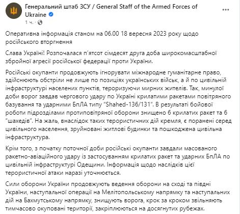 Генштаб ВСУ обнародовал сводку о ситуации на фронте на утро 18 сентября.