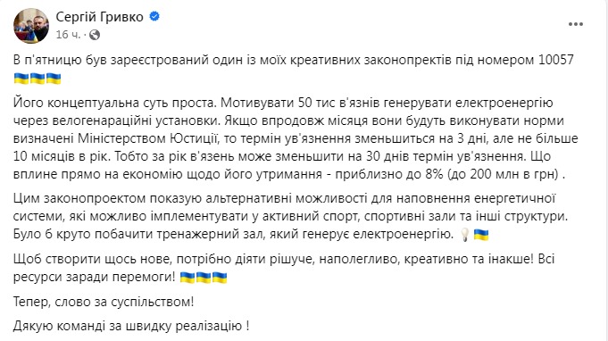 "Его концептуальная сущность проста. Мотивировать 50 тыс. заключенных генерировать электроэнергию через велогенарационные установки. Если в течение месяца они будут выполнять нормы, определенные Министерством юстиции, то срок заключения уменьшится на 3 дня, но не более 10 месяцев в год. То есть за год заключенный может уменьшить на 30 дней срок заключения. Что повлияет прямо на экономию по его содержанию – примерно до 8% (до 200 млн в грн)", - рассказал нардеп о своей инициативе.