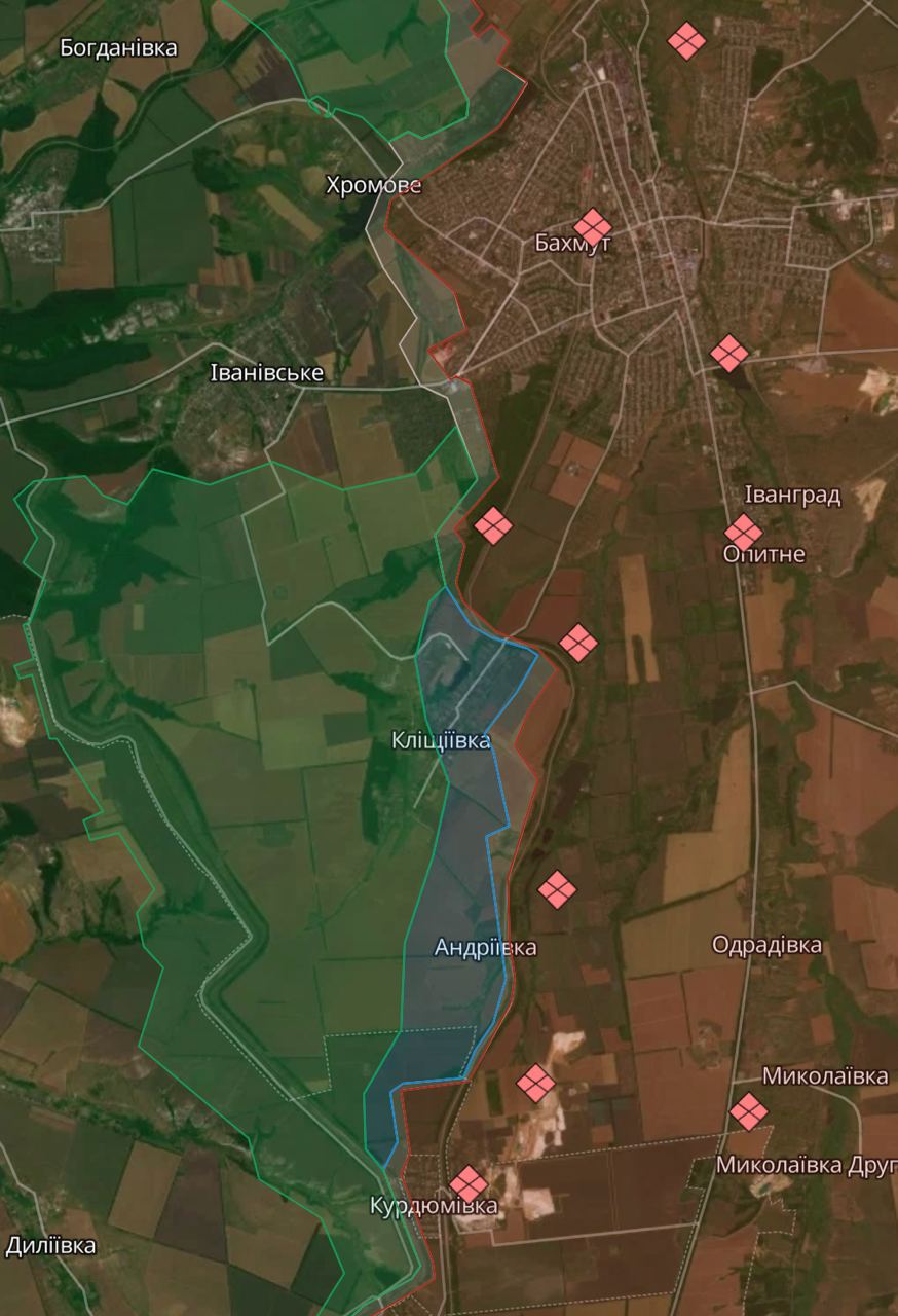 Южнее Бахмута Россия также пытается безуспешно отбить потерянные позиции в Андреевке и Клещеевке. Сообщается, что и ВСУ там ведут штурмовые действия.
