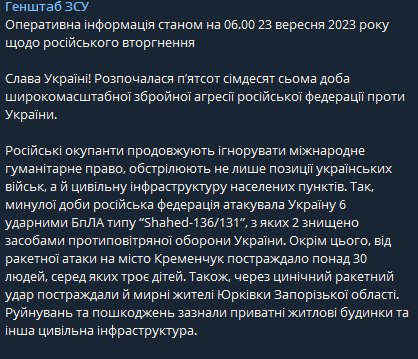 Оккупанты продолжают игнорировать международное гуманитарное право.За прошедшие сутки российская федерация атаковала Украину 6 ударными БпЛА типа Shahed-136/131, из которых 2 уничтожены средствами противовоздушной обороны Украины. Кроме этого, от ракетной атаки на город Кременчуг пострадали более 30 человек, среди которых трое детей. Также из-за ракетного удара пострадали и мирные жители Юрковки Запорожской области.