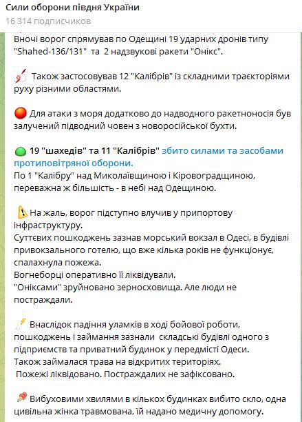 Были попадания в припортовую инфраструктуру. Существенные повреждения получил морской вокзал в Одессе, в здании привокзальной гостиницы, которая уже несколько лет не функционирует, вспыхнул пожар. Пожарные его ликвидировали. "Ониксами" разрушены зернохранилища. Но люди не пострадали.