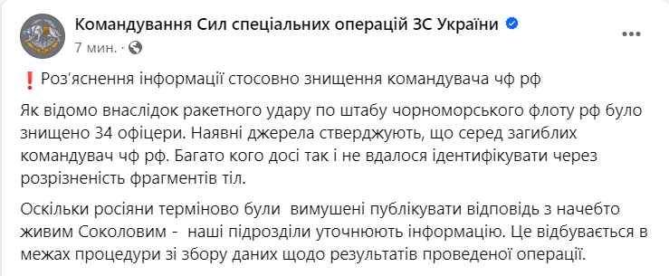"Как известно, в результате ракетного удара по штабу Черноморского флота РФ были уничтожены 34 офицера. Имеющиеся источники утверждают, что среди погибших командующий ЧФ РФ. Многих до сих пор так и не удалось идентифицировать из-за разрозненности фрагментов тел", - говорится в сообщении.