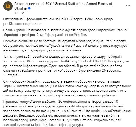 Утром 27 сентября Генштаб ВСУ обнародовал сводку о ситуации на фронте.