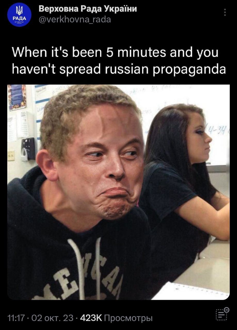"Когда ты уже пять минут не распространял российскую пропаганду", - подписано фото с Маском, которое опубликовал в Твиттере акаунт украинского парламента.